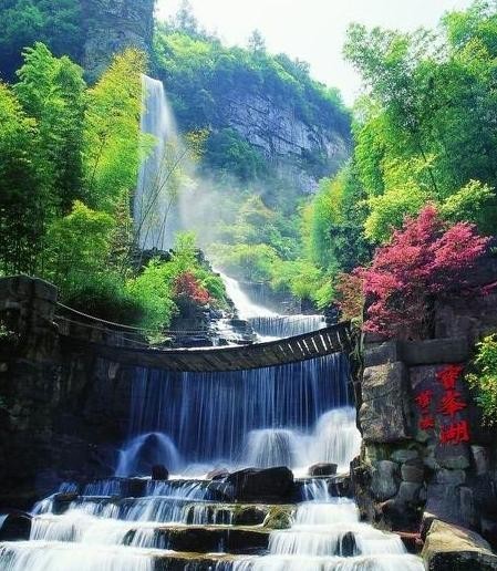 世界自然遗产——宝峰湖:被称为“世界湖泊经典”。地处张家界武陵源风景名胜区的核心地带,距天子山8公里,距武陵源区政府1.5公里,距黄龙洞8公里。宝峰湖风景区集山水于一体,融民俗风情于一身,尤以奇秀的高峡平湖绝景、“飞流直下三千尺”的宝峰飞瀑、神秘的深山古寺闻名。