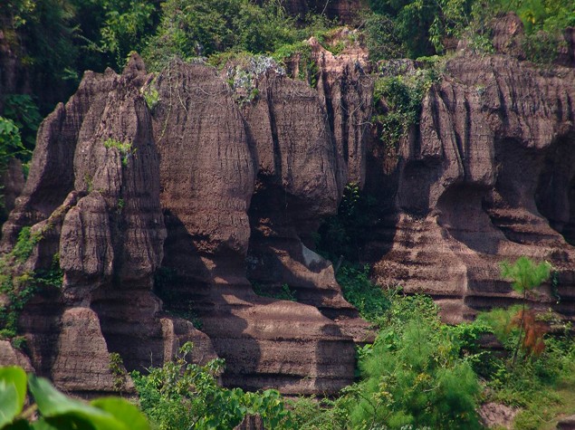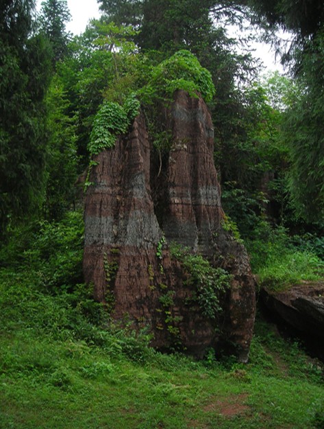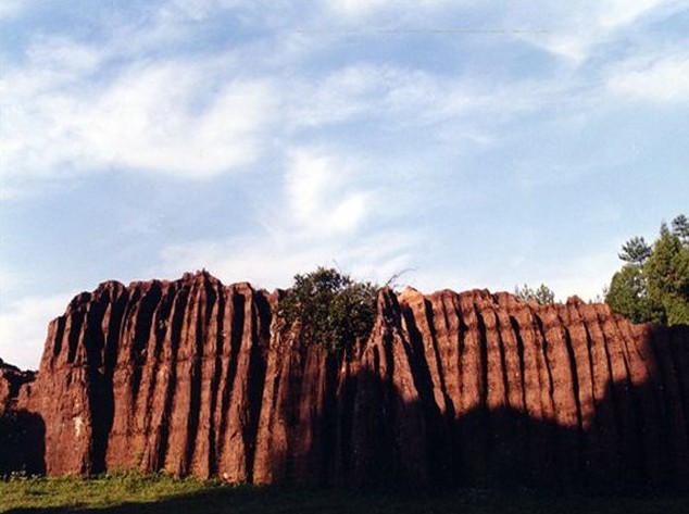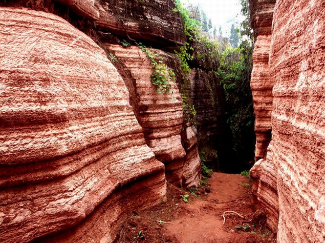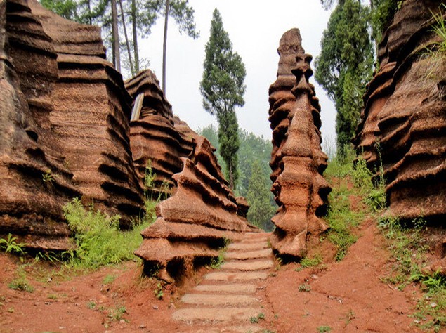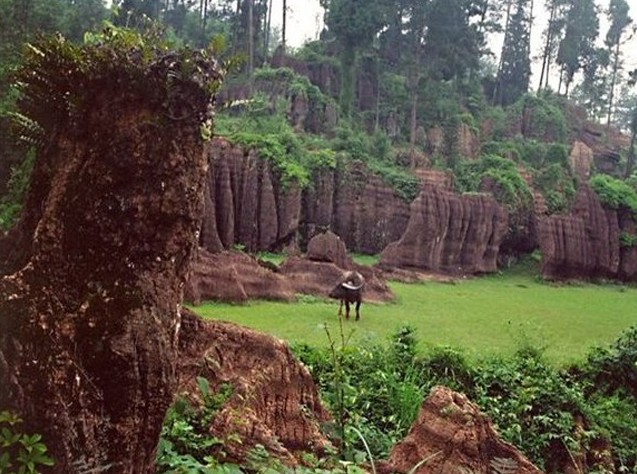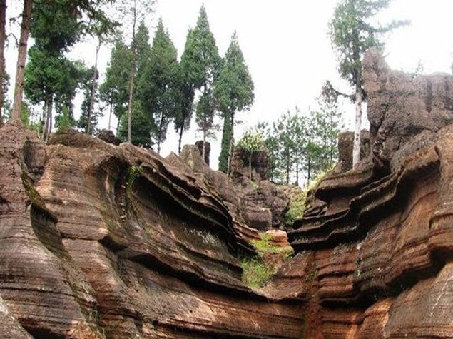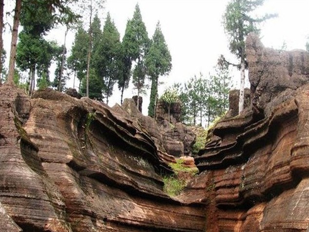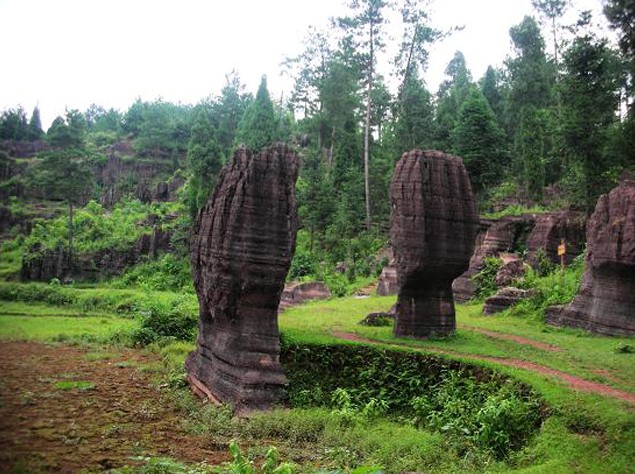 相传,有一年玉皇大帝准奏观音菩萨巡游人间,普查人间的山水胜景,以便日后下凡消遣。观音菩萨经过九九八十一天的风雨兼程,来到红石林。目及之处,怪石芸芸、奇特万象,胭脂芳香,胜之仙境。观音菩萨大悦,并情不自禁地依照莲花佛垫的模样在一条线上连续作了三个神记,以界定为天界之地。后来,作记号的三个地方同时生出三口水池来,且满池荷花终年不败,粉红的像云霞,白色的如烟雪,天下绝美,令人唏嘘。