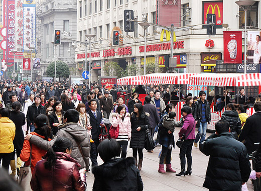 步行街上最多的是人,或从容信步,或匆匆疾走,或闲坐休息,或饶有兴致地转进每一家商店。街上跟人一样多的就是各种商店了,且都是上海店家中的“大腕”如华联商厦、第一食品商店、第一百货、新华书店南京东路店等,当然也少不了各大专卖店,“麦当劳叔叔”、“肯德基爷爷”自然不甘落后,而哈根达斯、天使冰王、必胜客也为有闲阶层提供了世界各地著名的美食。