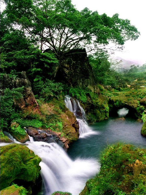 瀑布水自伏流涌出后,流淌一公里左右,便到了水上石林区。河水从石林的上面分开,环流两侧,又在下面交汇,把一座石林围在水中,区内水流蜿蜒曲折,石林星罗棋布,露出水面。