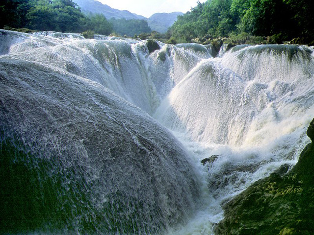 水上石林景区主要景观有银练坠潭瀑布、星峡飞瀑布、群榕聚会、根墙屏障、盘根壁画等。由于长年累月的波浪冲击和流水侵蚀,河床形成无数小坑穴,流水漫顶而下,仿若滚珠落玉,阳光这下,闪闪发光,似无数银练坠入潭中。较之云南石林,天星桥的水上石林以"水"见长,大自然在"水"字上做很好的文章。