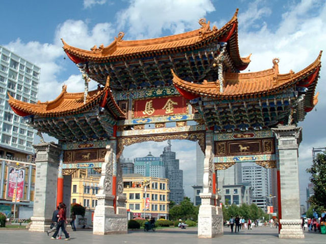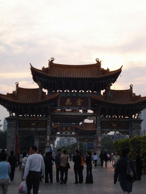 金马碧鸡广场位于昆明市中轴线的三市街与金碧路交叉口,被誉为昆明的象征。金马碧鸡坊始建于明朝宣德年间,高 12米 ,宽 18米 ,雕梁画栋,精美绝伦,具有典型的昆明民俗特色。金马碧鸡坊为两个坊的合称:东坊临金马山,名金马坊,西坊靠碧鸡山,名碧鸡坊。北与纪念赛典赤的“忠爱坊”相配,合称“品字三坊”,成为昆明闹市胜景;南与建于南诏的东西寺塔相映,显示了昆明古老的文明。古金马碧鸡坊在10年动乱中被拆毁,现在的建筑为1999年重修。如今的金马碧鸡坊不仅是昆明一景,而且这一带是一个充满生活气息与活力的商业街区。