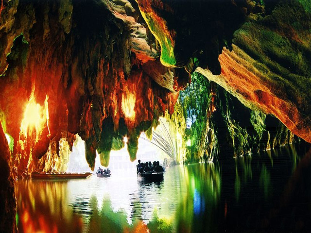 第一层水洞可通船890米,游客划船进洞,只见水洞蜿蜒曲折,岩壁如击案欲倒的狂澜,在即倒而未倒时凝面成形,充满着瞬间之永恒的动静效果,而铺陈成列的岩溶,有形态各异的石柱、石钟乳、石笋等。
